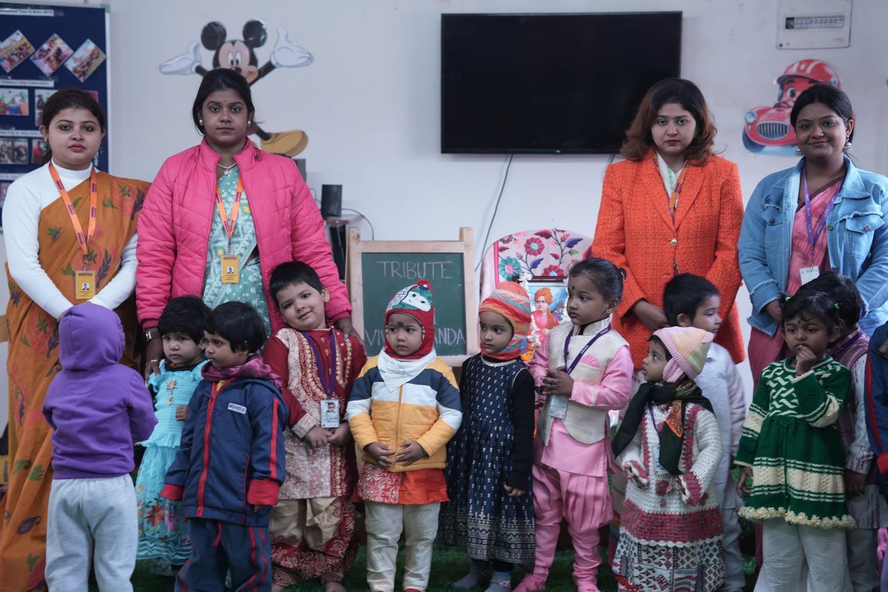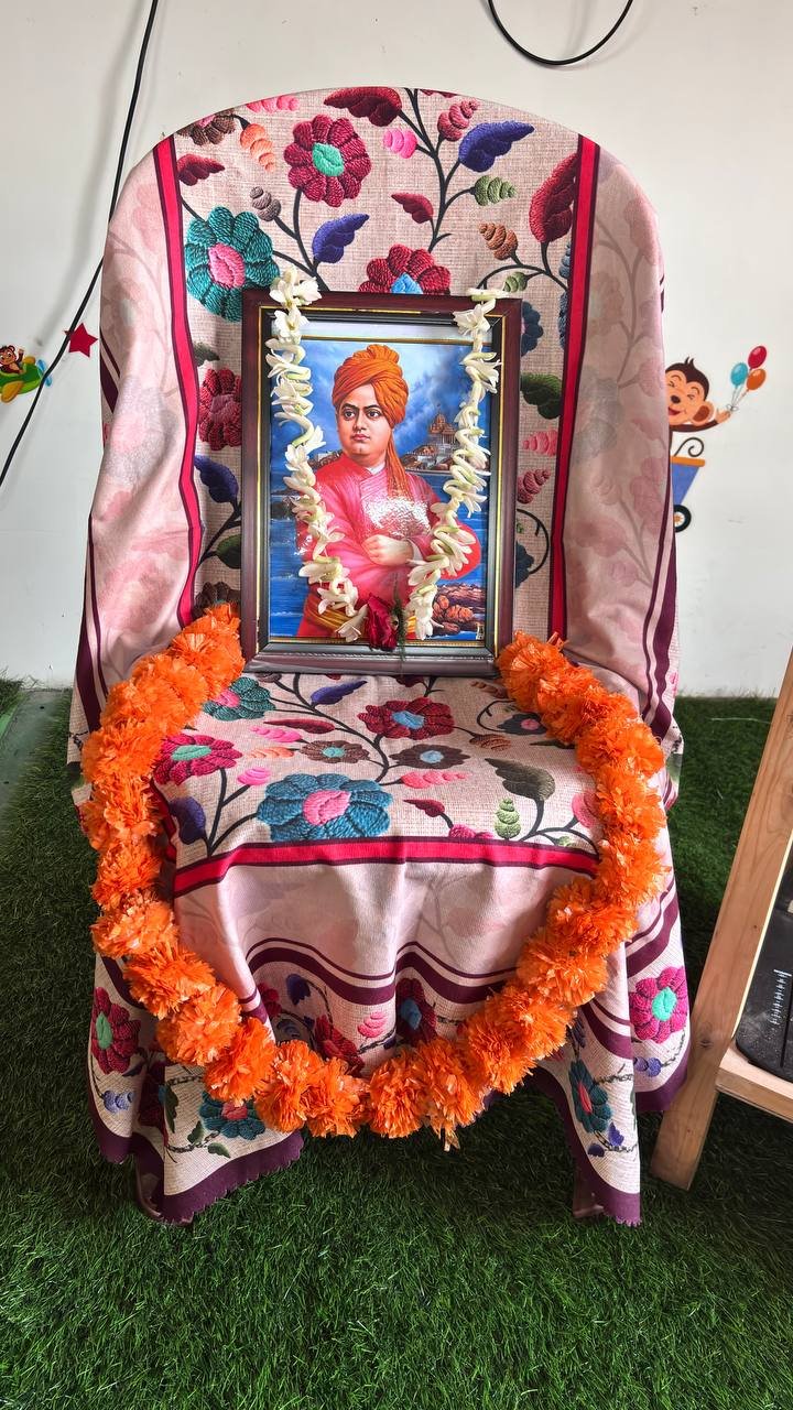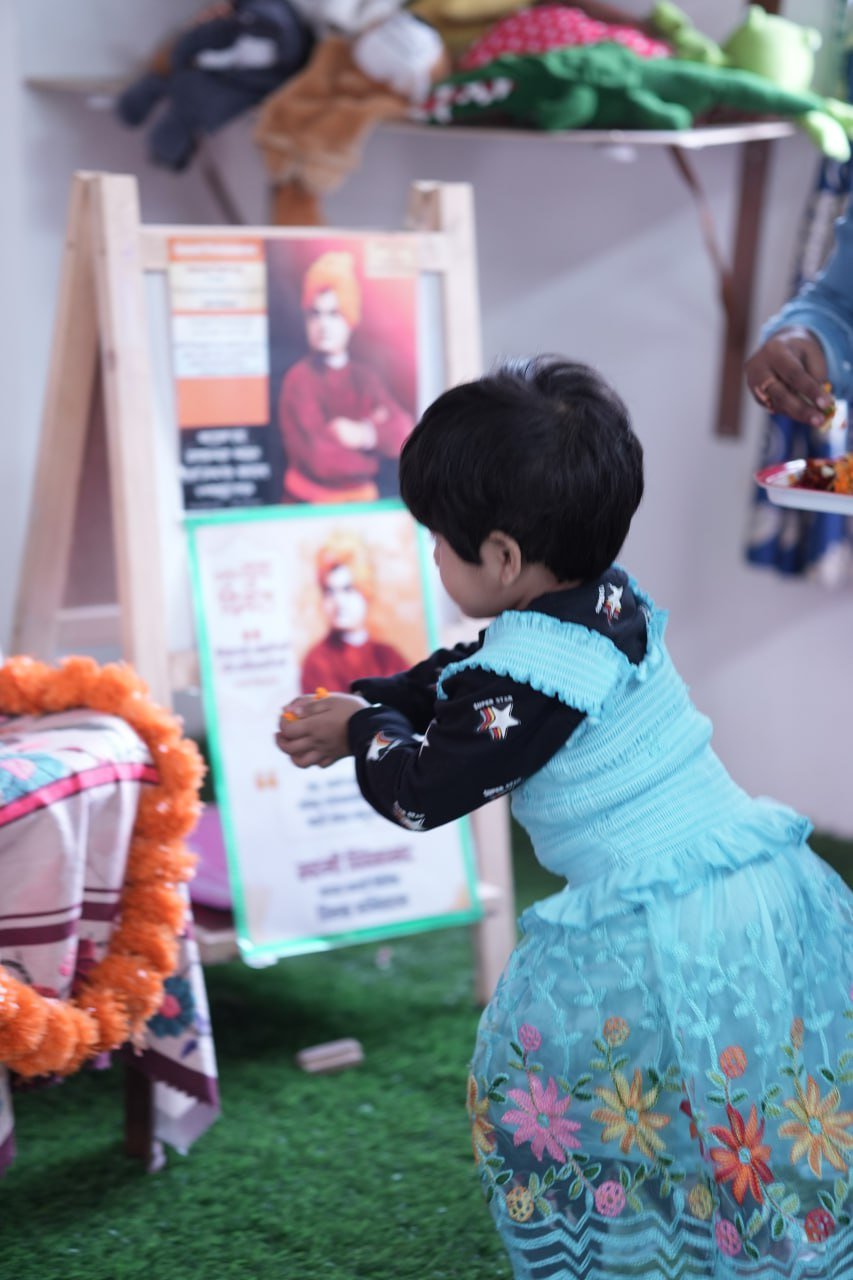 The celebration aimed to introduce young learners to the inspiring life, values, and teachings of Swami Vivekananda in an engaging and age-appropriate manner. The event began with a brief introduction to his life and contributions, helping children understand the importance of confidence, discipline, and kindness. Teachers guided the students throughout the program, ensuring that they not only participated but also understood the significance of the day. The celebration helped instill moral values, self-belief, and respect for great personalities among the children.